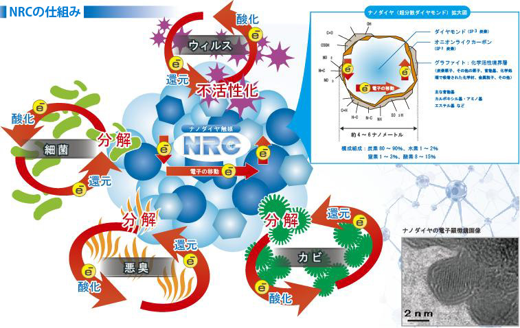 特殊製法されたNRC(炭素系有機無機複合化合物:特殊ナノカーボン)は科学的に安定し、光や温度の影響を受ける事なく安定した効果を塗布するだけで長期間発揮します。